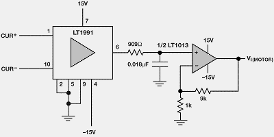 LT1995和LT1991精密增益放大器用不同方式测量电机的电压和电流(分别为图1和图3所示)。