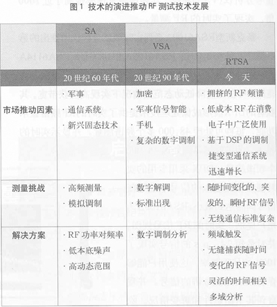 19世纪60年代,James Maxwell 通过计算推断出存在着能够通过真空传输能量的电磁波。此后工程师和科学家们一直在寻求创新方法利用无线电技术。接下来,随着军事和通信领域技术的深入发展,20世纪无线电技术一直在不断创新,技术的演进也推动着RF测试技术向前发展(见图1)。从军用的跳频电台、雷达到RFID,第三代移动通信、蓝牙、WLAN,各种微功率发射装置等,瞬态信号如今无处不在。瞬态信号存在的普遍性使得技术人员需要有效的仪器对其进行捕获、存储并回放分析。另外,监测间歇性干扰或频谱使用情况等也需要一种有效的手段来实现“宽带实时监测”。