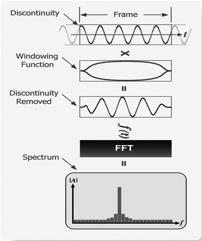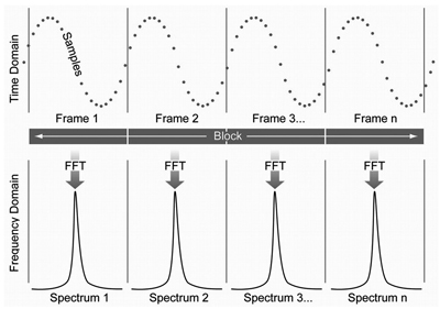 上一层是帧,帧由整数个连续样点组成,是可以应用快速傅立叶变换(FFT)把时域数据转换到频域中的基本单位。在这一过程中,每个帧产生一个频域频谱。