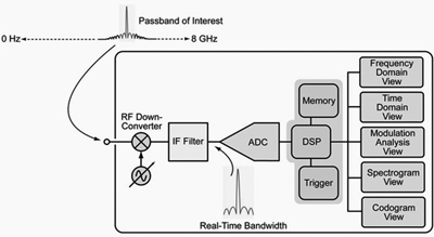 在实时频谱仪实时测量模式下,它无缝捕获每个块并存储在内存中。然后它使用DSP技术进行后期处理,分析信号的频率、时间和调制特点。
