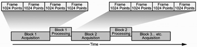图5是块采集模式,可以实现实时无缝捕获。对块内部的所有帧,每个采集在时间上都是无缝的。在一个采集块中的信号处理完成后,将开始采集下一个块??榇娲⒃谀诖嬷?,可以应用任何实时测量。例如,实时频谱模式下捕获的信号可以在解调模式和时间模式下分析。