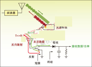 图1:无源标签对射频 RF能量进行整流并调制信号,然后反向散射反射给阅读器。