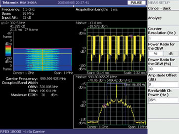 政府规定要求控制发射信号的功率、频率、带宽。这些规定防止有害干扰并保证每个发射者都是频带内其他用户的友好邻居。对于许多频谱分析仪特别是通常用于脉冲信号能量测量的扫频频谱分析仪,进行此类测量是具有挑战性的。RTSA 能够分析一个完整的分组发射过程的能量特点,也能直接测量跳频信号的载波频率,而无需将信号置于一个跨度的中心。按一下按键,分析仪就能识别一个瞬时 RFID 信号的调制方式并能够对功率、频率和带宽进行监管测量,使预一致性(pre-compliance)测试过程变得非常灵活和方便 [参阅图2]。预一致性测试有助于确保产品一次通过一致性测试,而无需重新设计和重新测试。