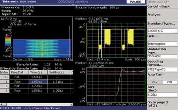 使用 RTSA 可以很容易地测量 TAT [参阅图4]。首先,需要安装一个频率模板触发器以获取标签与阅读器之间的整个查询。RTSA 的功率与时间关系视图使用户能够观看整个发射过程。习惯认为一个下行链路传输(由阅读器到标签)结束到下一个下行链路传输开始之间的时间就是半双工系统的 TAT。将一个标记放在标签询问的结束点,第二个 δ 标记置于反向散射的结束点或下一次阅读器进行数据发射的开始点,就可以精确测量出 TAT 时间。在大范围下行链路的条件下维持最短的 TAT 将有助于系统吞吐量的最大化。
