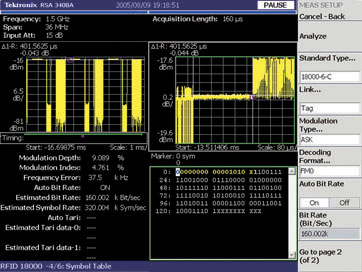 RTSA 也能解调与标签查询相关的符号或比特。用户只需选择相应的 RFID 标准、调制类型和解码格式。分析仪能自动检测并显示链路的比特率。为进一步提高工程师的生产效率,对恢复出的数据符号进行了基于功能的颜色编码(color-coded)。RTSA 能够自动识别前导符并将那些符号染成黄色。这易于识别实际的数据负荷并与已知值进行比较。