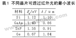 光波的近红外部分(波长约0.75~1.5 μm)可以透过晶片,不同的晶片对红外光的透射率不同。晶片可以透过的红外光的最小波长如表1所示。