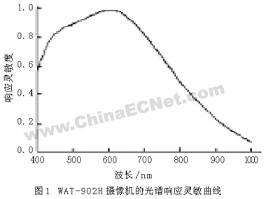 获得的图像质量直接影响图像处理程序的复杂度和检测结果。如果采用的光源单色性越好,越接近平行光,则图片的干涉条纹更清晰,质量更好。然而单色激光器或者平行光源体积大,而红外测试系统的一大特点就是结构简单、紧凑,而提供窄波段的照明价格比较昂贵,且不易控制,因此选用普通的白炽灯作为光源。为了得到较好的红外图片,在镜头的上方放置一块双面镜面抛光的硅片,从而过滤掉可见光对图片的影响。同时,选用超低照度黑白摄像机WAT-902H,它的光谱响应灵敏曲线如图1所示。而红外线波长为750 nm~1000μm,这样我们采用普通的光源就可以获得窄波段的红外图像。另外,由于该相机对红外波段的响应灵敏度不高,可以通过增加光强来克服,从而获得清晰的红外干涉图像,为后续的图像分析和处理做准备。