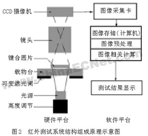 光源通过可变光阑照射到键合片,光线透过键合片,通过镜头,在摄像机上成像,从而获得键合片的红外图像,通过数据采集卡送入计算机,经过图像处理程序的处理,显示测试结果。
