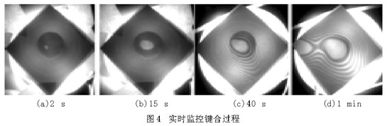 将红外检测应用到键合装置中,可以实时监控键合过程。图4(a)~(d)是截取的预键合过程中的4幅图片,可以清晰地观察键合波从中间向四周扩张的传播过程。图中所标的数字表示预键合时间(晶片经活化处理后,从两晶片开始接触到逐步键合所经历的时间)。1 min后,键合面积基本不再发生变化,预键合结果如图4(d)所示。