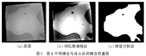 将上节中预键合的硅片在120。C下退火5 h,最终得到键合片的红外图片如图5(a),其键合质量如图5,键合率为60.20%。