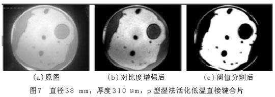 图6(a)和图7(a)中,圆形区域是要键合的圆片,其中明区为键合上的地方,暗区为未键合上的地方,圆形区域(即键合圆片)以外为图像背景。从图上可以大致地看出空洞(未键合区域)的分布、个数和大小等。为了获得更为准确的数据信息,借助图像处理程序对图片(a)进行对比度增强、平滑、分割等一系列处理,可获得图(b),(c),从而得到键合率。样品1的键合率为28.12%,键合率很低,并且从图6中空洞的分布可以看出,样品1键合得很不好。样品2的键合率为66.12%。比较图6和图7,样品2的键合质量明显优于样品1,可以说明键合圆片越薄,越容易键合??梢源悠桨謇砺劾斫庹庖患舷窒螅财奖?,界面表面能克服圆片翘曲贴合到一起所需要的力越小。