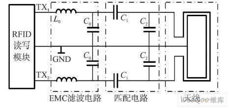 (1)电磁兼容( EMC)滤波(L0 , C0 )电路;(2)包含可调谐电容C1、C2 的匹配电路;(3)天线。