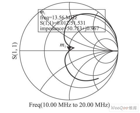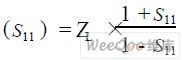 在载波频率为13. 56 MHz时,通过在TX1 和TX2 两点测量天线线路的反射系数(即参数S11 )来手动调谐,直到天线电路的输入阻抗达到目标,计算方程如下: