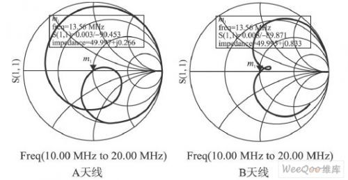 结果如图7所示,对于A, B两种天线的任何一种,都找到了最优C1 和C2 的组合。当频率为13. 56MHz时,两类天线的反射系数虽然与0点都有一定的偏差,但其偏差都在可接受范围之内。