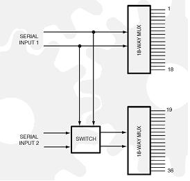 40-789射频开关??榭梢耘渲贸闪礁?8路的多路复用器(两个独立的输出)或一个单独的36路多路复用器。