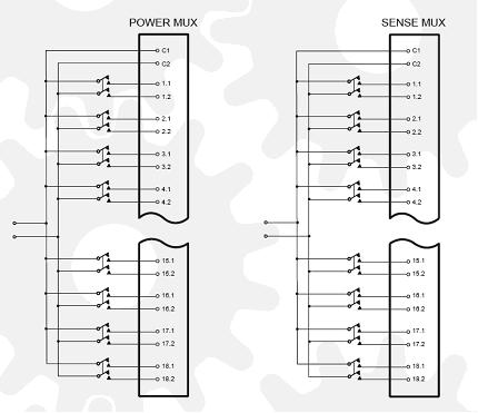 电源和手机之间的距离一般为几米,因此就会很难将手机中的电池的性能很好地发挥。采用配有遥感接口的快速反应电源就可以解决这个问题,该遥感即可调节的是手机上的电压,而不是电源的输出端的电压。需要四根线路来实现这个功能,两条电源连接线,两条传感连接线。这些连接线需要能够相互转换,这样就可以将它们同选定的手机进行连接。这些多路复用器中的两个可以用来转换36个手机中的信号。在电源的两端进行电源切换,这样就可以保证电缆的故障不会造成地面电流流向测试系统。
