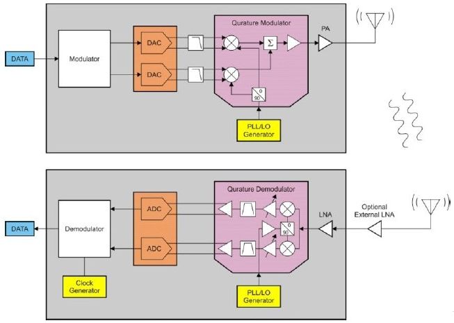 典型的低功耗无线链路由一个发送器件和一个或多个接收器件组成。发送器件由一个调制器、合成器、升频混频器和一个功率放大器(PA)组成。接收机由互逆器件、低噪声放大器(LNA)、降频混频器、合成器和解调器组成。
