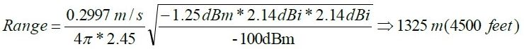 例如,如果使用弗里斯方程式计算一个2.45GHz 无线链路的最大通信距离,其发射功率为-1.25dBm,接收灵敏度为-100dBm 以及两个天线增的益都是2.14dBi。需要注意的是,2.14dBi 是偶极天线的理论增益,而考虑损耗时一般达不到这一值。