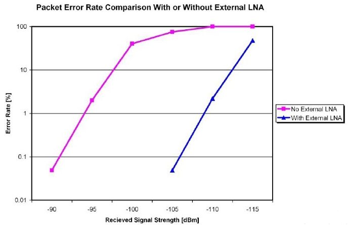 图2:有/无外部LNA的低功耗无线接收机的误包率对比。本例中实现了15dB的增益改善。