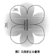 由于环形天线的电磁场在其临近区域分布不均匀,因此会出现读写盲区。如图2中黑线勾勒出的范围之外区域一般为单个天线的读写盲区。经反复实验证明将电子标签摆放位置转到与最佳位置成40°角区域时,一般可正常读写操作。
