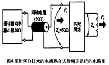 本文研究的RFID读写器频率为13.56 MHz,为有效抑制功率反射、寄生辐射等高频效应,通常是将读写器天线通过同轴电缆连接到读写器的高频??椋岬缋伦杩刮?0 Ω。因此,天线的阻抗匹配就是通过一定的无源匹配电路来改变读写器天线的输入阻抗,使其与同轴电缆的阻抗保持一致,这样就可使能量通过同轴电缆几乎无损失的从读写器传送出去。图4为采用50 Ω技术的电感耦合式射频识别系统电路。