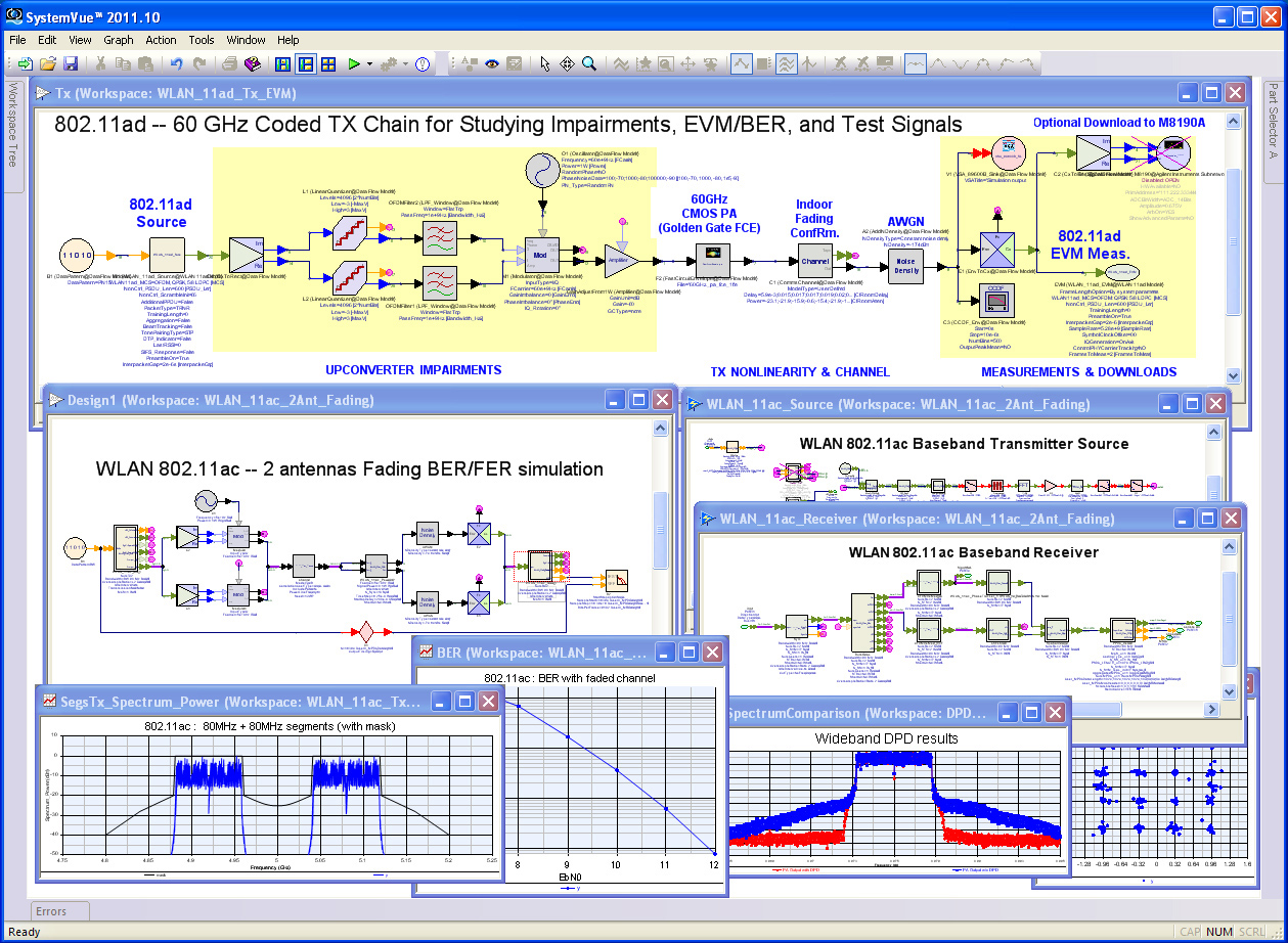 利用这个新程序库,系统架构师现在可以查看 802.11ac 算法和模型的系统级效率,信号质量的预失真、减损、干扰和衰落,以及比特误码率。