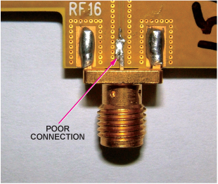 其次需要考虑PCB的装配连接器与PCB传输线路之间的结点至关重要,因此连接器的焊接会对过渡产生重大影响。连接不良或未对齐的连接器会破坏电感和电容之间的微妙平衡,从而影响结点的阻抗。图5是一个焊接不良的连接器结点示例。
