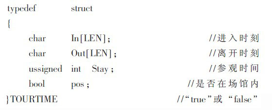 当游客在图1 中入口处的0 号读写器刷卡后, 即可授权进入博物馆参观, 游客门票中的标签ID 号信息被送往PC 上位机实时处理, 建立游客文档INFO.游客文档包括进入各场馆的时间、离开各场馆的时间、在各场馆参观的时间、当前所在的场馆区域及游客头像等信息,INFO 的结构体表达式如下: