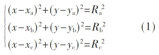 如图3 所示, 在游戏场馆C 区内, 设编号分别为a 、b 、c 的三个有源读写器的位置为(xa,ya) , (xb,yb) , (xc,yc) ,游客的位置坐标(x,y), 三个读卡器到游客的距离分别为Ra、Rb、Rc, 由时间信息定位方法(TOA) 可得式(1) , 即可求解游客的位置坐标(x,y)。