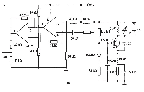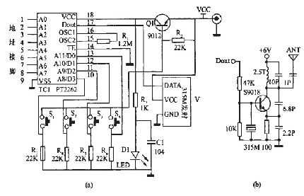 该部分电路主要由315MHz无线数据发射??楹捅嗦爰蒔T2262组成。该无线发射??樵硗既缤?中(b)所示,它具有较宽的工作电压范围3-12V,当电压变化时发射频率基本不变,和发射??榕涮椎慕邮漳?槲扌枞魏蔚髡湍芪榷ǖ亟邮?。当发射电压为3V时,空旷地传输距离约20-50m,发射功率较??;当电压5V时约100-200m)当电压9V时约300-500m;当发射电压为12V时,为最佳工作电压,具有较好的发射效果,发射电流约60毫安,空旷地传输距离700-800m,发射功率约500mW.当电压大于12V时功耗增大,有效发射功率不再明显提高。发射??椴捎肁SK方式调制,以降低功耗。当数据信号停止时发射电流降为零,数据信号与DF发射模块输入端可以用电阻或者直接连接而不能用电容耦合,否则DF发射??榻荒苷9ぷ?。数据电平应接近DF数据??榈氖导使ぷ鞯缪梗曰竦媒细叩牡髦菩Ч?。