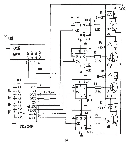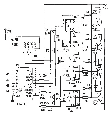 该部分电路主要由315MHz无线数据接收模块、解码集成PT2272,D触发器4013和继电器电路组成。