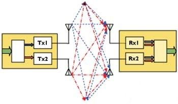 通过使用多路传输方式,在每个接收天线上采用空间微分技术,使得DSP能够进行信号分离并恢复原始的两路数据流。使用相同射频信道的独立发射器,在它们各自的天线上发送出独立的数据,然后,接收天线汇集所有发射器的复合信号。通过巧妙设计的MIMO报文和先进的DSP,就可以恢复出独立的数据流。数据速率与发射器和天线数量之间具有几乎线性的关系,速率的提高并不需要增大信道带宽。
