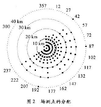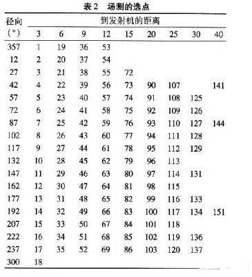 覆盖测试是根据特定的半径和幅角在圆周上进行选点的,这些测试点的选择总共包含18个不同幅角(12,27,42,58,72,87,102,117,132,147,162,177,182,207,222,287,300,357),对应于以发射机为圆心的3,6,9,12,15,20,25,30和40 km这几个半径上。选点是出于幅角的考虑,展现了至少45 dBμV/m内的场强估计,并根据地形信息通过算法得到有用信息。图2展示了场测选点的地形分配,测试点的具体参数,如表2所示。