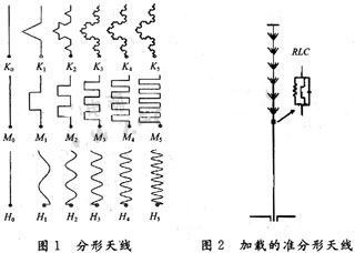 由于单纯的RLC加载对小型化天线设计具有局限性。在保证一定效率的前提下,要进一步减小单极子天线的尺寸,还需要做进一步的研究。其中弯折线天线和分形天线是适应设计发展的又一技术方法。如图1所示。