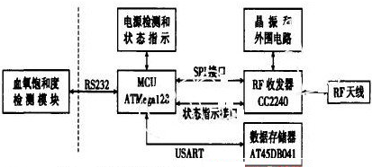 MCU部分是WPAN通信??榈暮诵?完成通信模块各组成部分的控制、协调和数据的加工。具体功能:通过RS232接口与血氧饱和度检测??橥ㄐ?实现对它的控制和配置,并接收检测数据;通过SPI接口和状态指示接口实现对RF收发器的配置和检测,并完成发射和接收的数据交换;通过USART接口与数据存储器连接,完成数据存储器的读写操作;通过电源检测和状态指示部分,监测电源电压情况,并能通过状态指示产生报警提示?! ?br />