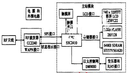 CPU部分完成主站各组成部分的控制、协调和数据的加工。具体功能:通过系统总线与存储器相连,完成相关数据的加工、处理和存储;通过LCD接口与彩色液晶显示器相连,实现信息的显示,以实现人机交互;通过触摸屏接口与触摸屏相连,实现控制命令的输入;通过总线接口与以太网控制器相连,可将检测仪接入后台支持网络,实现系统信息的集中化管理和与后台管理系统的融合;通过SPI接口和状态指示接口实现对RF收发器的配置和检测,并完成发射和接收的数据交换,实现与检测仪移动终端的通信;通过电源和外围电路,实现对系统的供电?! ?br />