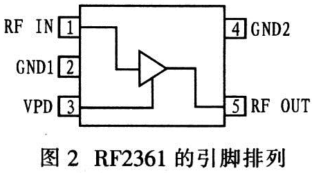 图2为RF2361的引脚排列,其中:RF IN为低噪声功率放大器输入,需通过一阻抗匹配网络达到50Ω阻抗匹配:RF0UT为低噪声功率放大器输出,也需通过一阻抗匹配网络达到50Ω阻抗匹配;同时电源VCC给整个电路提供工作电压。VPD用于控制偏置电流,与偏置电阻R1共同确定偏置电流。GND1、GND2为接地。