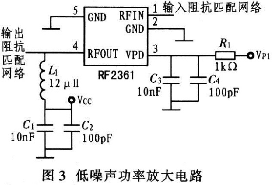 以低噪声功率放大器RF2361为核心设计的低噪声功率放大电路,如图3所示,其VPD引脚上的并联电容器实现电源VPD的滤波,RFOUT引脚上的电感电容串并联网络可对电源VCC滤波?! ?/p>