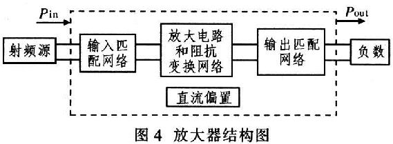 典型的放大器一般包括输入匹配网络、晶体管放大电路、阻抗变换网络、直流偏置和输出阻抗匹配网络,如图4所示。确定阻抗匹配网络中元件的参数、类型以及连接关系是实现匹配网络的关键。阻抗匹配是射频电路设计的重要问题,其目的是为了实现能量的最大功率传输,提高能量的传输效率?! ?/p>