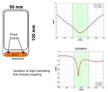 还有一种可行的解决方案,使用SkyCross公司提供的隔离模式天线技术(iMAT),从相同的天线结构产生两种不同的模式。iMAT天线结构放置在手机的一端;两个馈点分别运行不同的辐射模式。这两个馈点是相互隔离的,不会发生互耦导致的损耗,因此每种模式的效率都很高。另外,辐射图案是不同的,因此会产生一个较低的相关系数。图4描述了iMAT天线的实现原理,从图中可以看到,在相同天线结构上的两个馈点之间的隔离。
