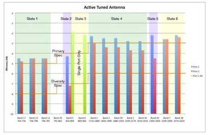 为了缓解各种使用模型的影响,有必要将状态调谐和模式隔离两种方法结合运用。模式隔离允许具有多个馈点的单天线结构执行多个MIMO天线的功能;而状态调谐则允许这种结构非常小,但仍然能够非常高效地在宽频率范围内工作。图5显示了以6个调谐状态覆盖多个频段的可变状态iMAT天线结构的平均测量效率。iMAT结构能在平衡或不平衡的增益配置下工作,并且与传统天线设计技术相比,能以更小的封装提供更高的性能。