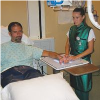 佛罗里达州那不勒斯NCH医疗保健系统放射实习生正在展示便携式X光机的无线DR成像板能够根据需要进行最优的调整