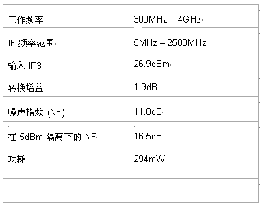 - 具卓越的 26.9dBm IIP3、294mW 的低功耗和 2.5GHz 的宽 IF 带宽