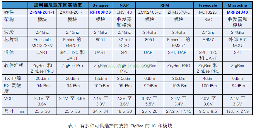 IC 和模块中都提供有 ZigBee 解决方案(见表1)。 商业使用本规范不收取费用 - 制造商必须属于 ZigBee 联盟,最终产品必须