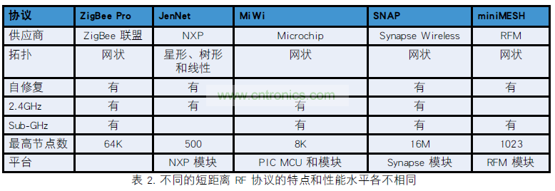 使用芯片制造商开发的专有协议可免去 ZigBee 许可证费(见表 2)。 NXP 提供 JenNet 协议,该协议在 2.4GHz 波段内运行,能组建树状、星状和线性自修复网络,最高包含500 个节点。 Microchip 的免费 MiWi 堆栈同时以 sub-GHz和 2.4GHz 两种频率,在 PIC 微控制器和 Microchip 收发器上运行。