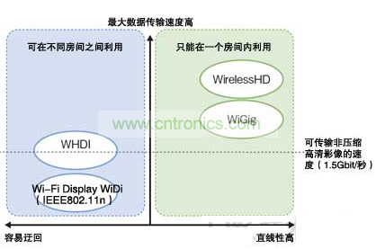 Wi-Fi Display、WiDi和WHDI因电波比较容易迂回,适用于在不同房间的连接,采用60GHz频带毫米波的WirelessHD和WiGig虽然可以确保传输速度,但如果有障碍物的话,电波难以到达,因此主要在一个房间内使用。