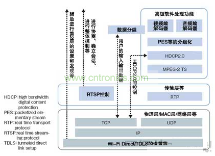 Wi-Fi Display是以无需经由WLAN接入点即可在终端间直接通信的标准“Wi-Fi Direct”为基础,由上层的协议栈软件构成的安装指南。锁定终端服务的“服务发现(Service Discovery)”等的处理利用Wi-Fi Direct进行,影像的压缩/解压处理及管理数据流的传输层等利用Wi-Fi Display处理(图2)。压缩/解压采用H.264格式。由于最近的智能手机不但标配WLAN功能,采用内置H.264编解码器电路GPU的终端也很多,因此Wi-Fi Display还具有易于配备到终端中的特点。“在受限于安装面积和耗电量的智能手机中,无需追加硬件即可配备的优势非常大”(Cavium公司的柴田)。