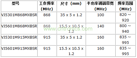 VJ5301M868MXBSR、VJ5301M915MXBSR、VJ5601M868MXBSR和VJ5601M915MXBSR采用贵金属电极技术(NME)和湿法加工工艺,具有高可靠性、陶瓷氧化物本体结构。符合RoHS的片式天线也符合per IEC 61249-2-21的无卤素规定,可用标准的回流焊安装到PCB板上。