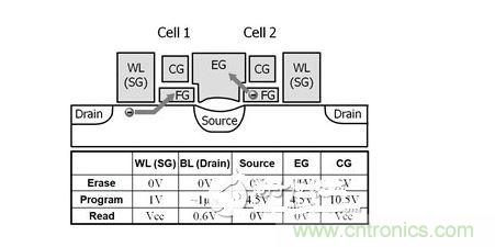 1 第3代SuperFlash存储单元的结构和典型工作条件。图中给出了两个共用源极和擦除栅极的单元。图中用箭头指示烧写(单元1)和擦除(单元2)期间的电子转移情况。WL为字线(选择栅极),CG为耦合栅极,EG为擦除栅极,FG为浮置栅极。