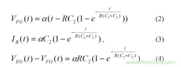 图5显示了SuperFlash单元的简化R-C图及其等效电路。其中,C1为EG-FG电容,C2为总FG电容与CFG-EG的差值,R为有效隧穿电阻。VEG线性斜坡(VEG=αt)和欧姆电阻R组成的等效电路中的瞬变具有简单的闭环解决方案:
